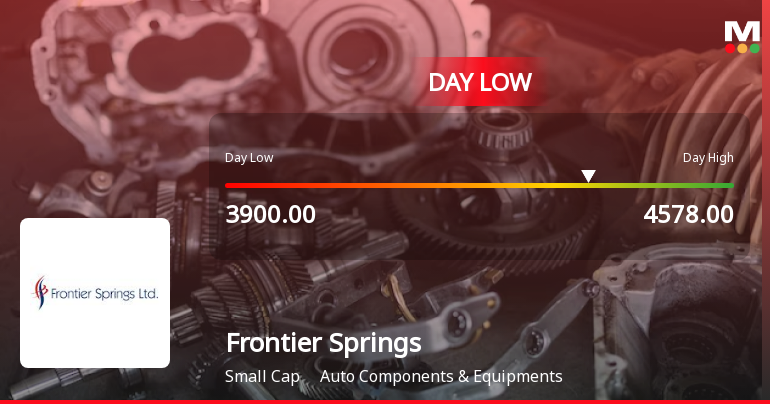 Frontier Springs Ltd experienced a significant intraday decline on 21 Jan 2026, touching a low of Rs 3,900, reflecting a sharp price correction amid broader market weakness and sector underperformance. The stock fell by 9.56% during the day, underperforming its sector and the benchmark Sensex.
