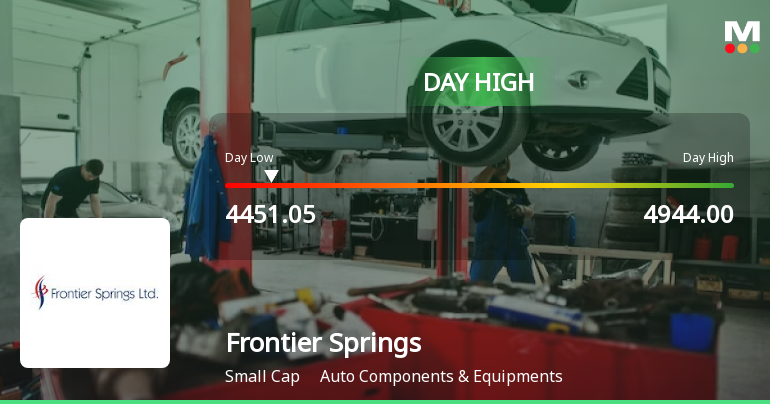 Frontier Springs Ltd demonstrated robust intraday strength on 22 Jan 2026, surging to an intraday high of Rs 4,944, marking an 11.97% increase from its previous close. This performance notably outpaced the Auto Components & Equipments sector and broader market indices, reflecting a decisive rebound after two days of decline.