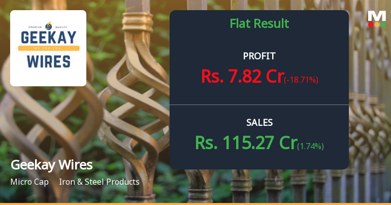 Geekay Wires Ltd., a micro-cap player in the iron and steel products sector with a market capitalisation of ₹301.75 crores, reported net profit of ₹8.35 crores for Q2 FY26, representing a sequential increase of 16.13% from Q1 FY26's ₹7.19 crores but a year-on-year decline of 9.24% from Q2 FY25's ₹9.20 crores. The results present a mixed picture—whilst operating margins expanded dramatically, revenue growth remained virtually flat, raising questions about the sustainability of recent profitability improvements. The stock has reacted negatively to the broader challenging environment, declining 5.03% on February 02, 2026, to close at ₹28.87, and now trades 37.24% below its 52-week high of ₹46.00.
