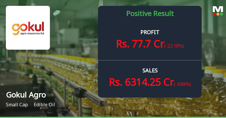 2026-02-06 16:00:28Gokul Agro Resources Ltd, a key player in the edible oil sector, has reported a notable shift in its financial trend from positive to flat in the December 2025 quarter, despite registering robust revenue and profit growth. The company’s latest six-month net sales surged by 32.19% to ₹12,952.44 crores, while profit after tax (PAT) rose 24.22% to ₹178.85 crores, signalling operational strength amid a challenging market backdrop.