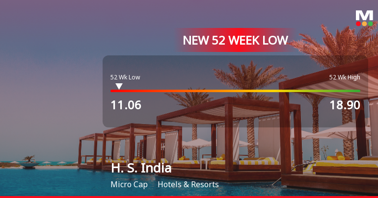 "description": "Shares of H. S. India Ltd, a player in the Hotels & Resorts sector, declined sharply to a fresh 52-week low of Rs 11.06 on 23 Jan 2026, marking a significant milestone in the stock’s ongoing downward trajectory. The stock underperformed its sector and broader market indices amid heightened volatility and subdued financial metrics."