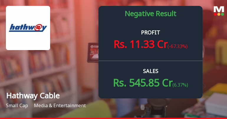 2026-04-18 19:00:26Hathway Cable & Datacom Ltd., India's leading fixed-line internet service provider and cable television operator, reported a disappointing fourth quarter for FY26, with consolidated net profit plummeting 67.33% year-on-year to ₹11.33 crores from ₹34.68 crores in Q4 FY25. The Reliance Group-owned company, with a market capitalisation of ₹2,039 crores, saw its stock trade at ₹11.62 on April 17, 2026, reflecting a modest 1.22% gain on the day but remaining under pressure with a year-to-date decline of 6.74%.