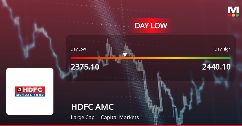 2026-03-19 15:01:21Shares of HDFC Asset Management Company Ltd declined sharply on 19 Mar 2026, touching an intraday low of Rs 2,375.1, reflecting a 3.79% drop from previous levels. The stock underperformed despite outperforming its sector, as broader market pressures weighed heavily on investor sentiment.
