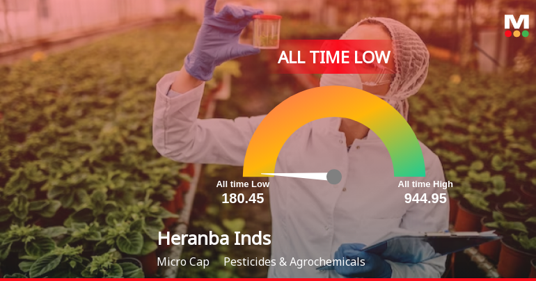 2026-03-13 09:35:41Heranba Industries Ltd, a player in the Pesticides & Agrochemicals sector, has reached a new all-time low of Rs.180.45, marking a significant milestone in its ongoing decline. The stock’s recent performance reflects sustained pressures, with losses extending over multiple time frames and a deteriorating financial profile.