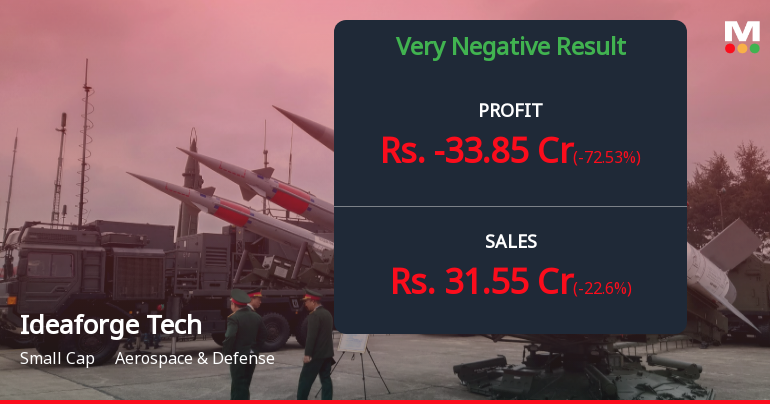 2026-01-23 09:52:13Ideaforge Technology Limited, India's indigenous drone manufacturer, reported a consolidated net loss of ₹33.85 crores for Q3 FY26, marking a 72.53% sequential deterioration and a 40.92% year-on-year decline. Despite a 79.16% YoY revenue surge to ₹31.55 crores, the small-cap defence stock has plunged 23.00% over the past year, significantly underperforming the Sensex's 7.51% gain, as operational losses continue to mount and investor confidence erodes.
