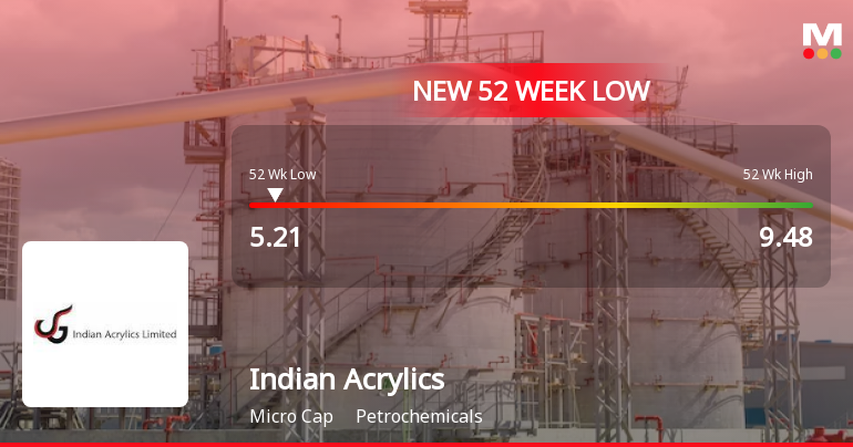 2026-03-02 12:04:41Indian Acrylics Ltd, a player in the petrochemicals sector, recorded a fresh 52-week low of Rs.5.21 today, marking a significant decline in its stock price amid ongoing market pressures and sectoral underperformance.