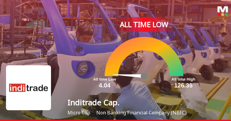 "description": "Inditrade Capital Ltd, a Non Banking Financial Company (NBFC), has reached a new all-time low of Rs.3.9, marking a significant milestone in its ongoing downward trajectory. The stock’s performance continues to lag behind key benchmarks, reflecting persistent difficulties within the company’s financial and market standing."