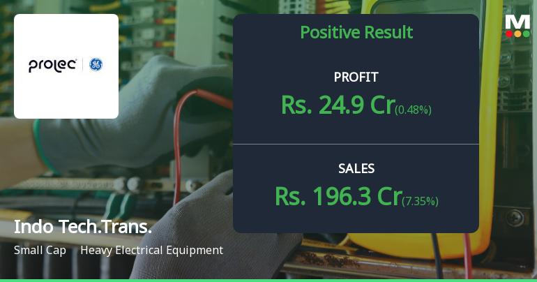 2026-02-05 19:22:50Indo Tech Transformers Ltd's latest financial results for Q3 FY26 reflect a continuation of operational strength, characterized by notable revenue and profit growth. The company reported net sales of ₹196.30 crores, marking a 7.35% increase from the previous quarter and a 10.69% rise year-on-year. This performance indicates robust demand and effective execution of its growth strategy. Net profit for the quarter reached ₹24.90 crores, showing a slight sequential increase of 0.48% and a significant year-on-year growth of 29.22%. The profit after tax (PAT) margin was recorded at 12.68%, which, while down from the previous quarter, remains higher compared to the same period last year, suggesting effective cost management despite some margin compression. Operating margins, excluding other income, stood at 16.81%, reflecting a minor sequential decline but a substantial year-on-year improvement. This consistency...