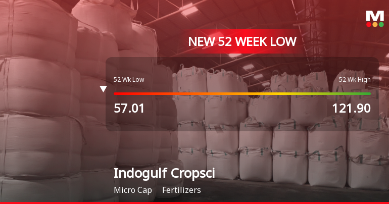 2026-03-19 10:39:10Indogulf Cropsciences Ltd’s stock declined sharply to hit a new 52-week and all-time low of Rs.57 on 19 Mar 2026, marking a significant milestone in its recent price trajectory. The stock underperformed its sector and broader market indices, reflecting ongoing pressures within the Fertilisers industry and the micro-cap segment to which it belongs.