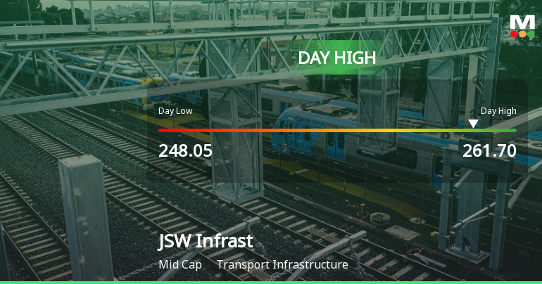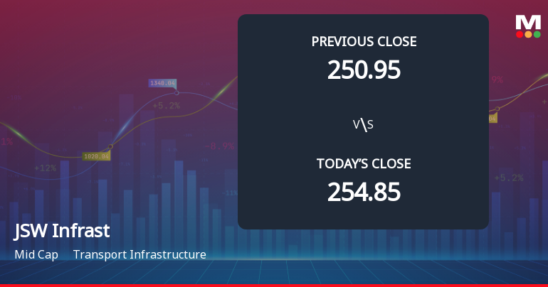 2026-03-05 15:01:02JSW Infrastructure Ltd demonstrated robust intraday performance on 5 Mar 2026, surging to an intraday high of Rs 259.75, marking a 5.25% increase from its previous close. This notable uptick outpaced the broader Transport Infrastructure sector and the Sensex, reflecting a significant rebound after three consecutive days of decline.