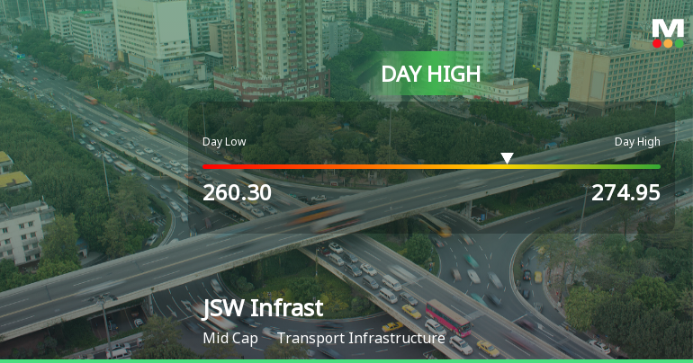 2026-03-06 12:01:02JSW Infrastructure Ltd demonstrated robust intraday strength on 6 Mar 2026, surging to an intraday high of Rs 273.9, marking a 4.78% rise and closing the day with a notable 5.15% gain. This performance outpaced its sector and the broader market, underscoring a significant positive trading session despite a subdued Sensex.