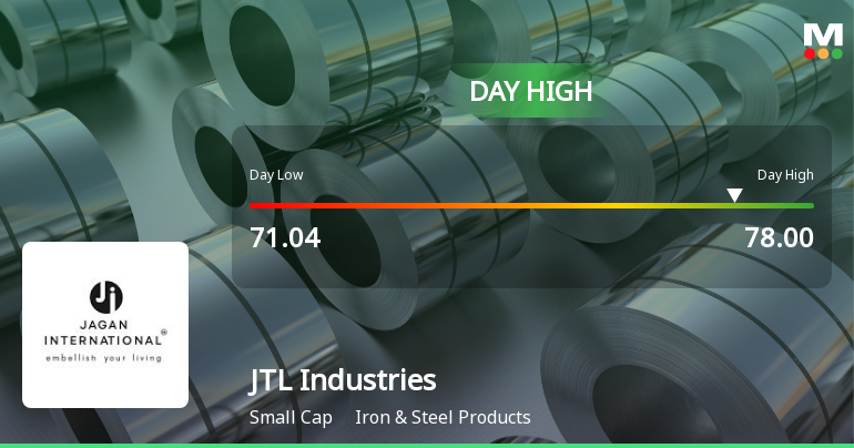 2026-01-22 15:16:19JTL Industries Ltd recorded a robust intraday performance on 22 Jan 2026, surging to an intraday high of Rs 77, marking a 7.44% increase and outperforming its sector by 5.44% amid a positive market backdrop.