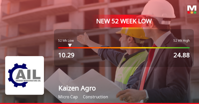 2026-01-20 11:08:00Kaizen Agro Infrabuild Ltd’s stock declined to a fresh 52-week low of Rs.10.29 on 20 Jan 2026, marking a significant drop amid a challenging market environment and ongoing underperformance relative to its sector and benchmark indices.