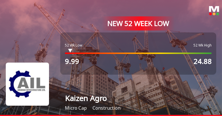 2026-02-02 14:37:39Kaizen Agro Infrabuild Ltd’s stock price declined to a fresh 52-week low of Rs.9.99 today, marking a significant milestone in its ongoing downward trajectory. The stock has underperformed both its sector and broader market indices, reflecting persistent challenges in its financial and market performance.