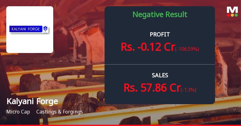 Kalyani Forge Ltd., a micro-cap player in India's castings and forgings industry with a market capitalisation of ₹218.00 crores, reported a troubling Q3 FY26 performance that saw the company slip into losses despite operational improvements. The company posted a net loss of ₹0.12 crores for the quarter ended December 2025, marking a stark reversal from the ₹2.15 crores profit recorded in Q2 FY26 and the ₹1.82 crores profit in Q3 FY25. The stock has responded negatively to the company's ongoing challenges, declining 0.70% in recent trading and underperforming the broader market significantly over multiple timeframes.