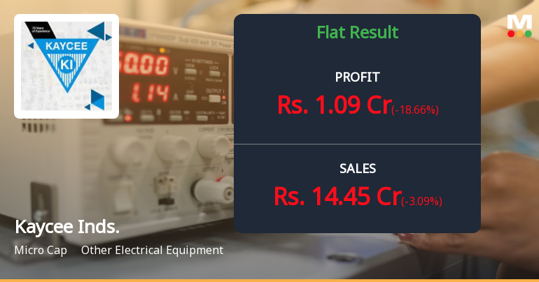 2026-02-03 17:46:18Kaycee Industries Limited, a Mumbai-based electrical equipment manufacturer, reported consolidated net profit of ₹1.09 crores for Q3 FY26 (October-December 2025), representing a year-on-year growth of 15.96% but a sequential decline of 18.66% from Q2 FY26. The company's stock, currently trading at ₹729.30 with a market capitalisation of ₹225.00 crores, has witnessed significant volatility, plunging 36.12% over the past year despite strong three-year returns of 398.81%.