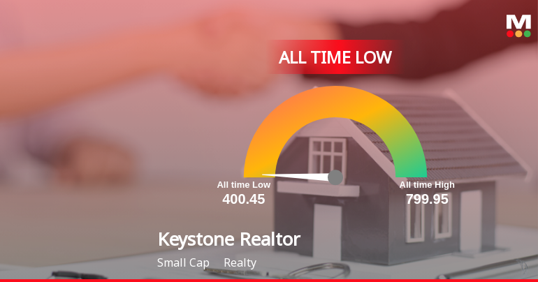 Keystone Realtors Ltd has reached an all-time low, closing near its 52-week bottom at Rs 400.45, marking a significant decline amid ongoing underperformance relative to the broader market and its sector peers.
