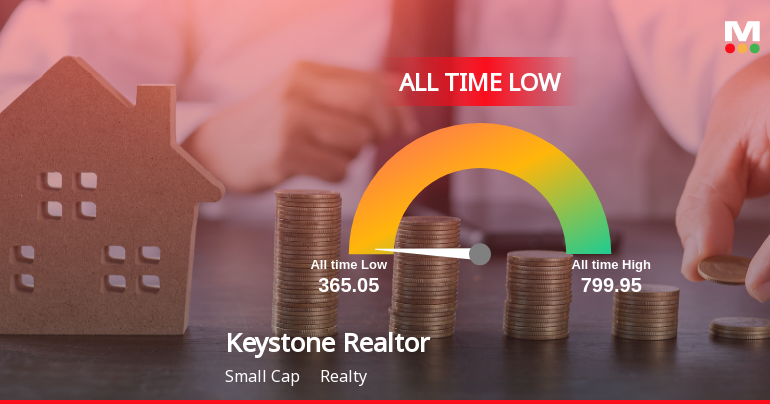 Keystone Realtors Ltd touched a new 52-week and all-time low of Rs.365.05 today, marking a significant decline amid a sustained negative trend. The stock has underperformed its sector and broader market indices, reflecting ongoing pressures on the company’s financial performance and valuation metrics.