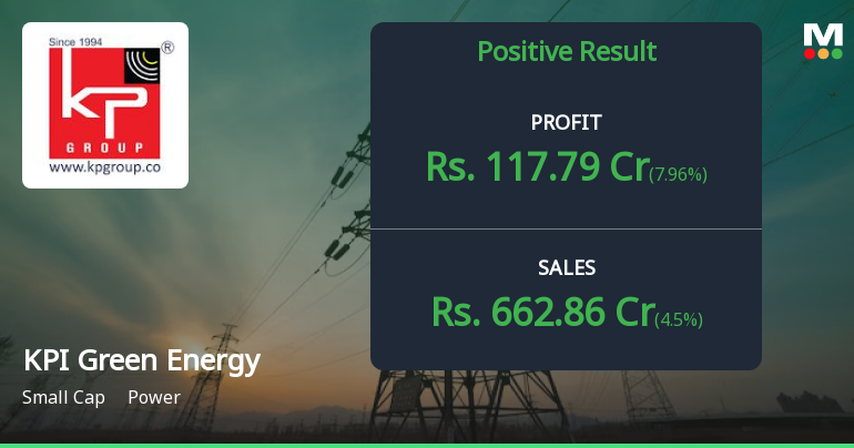 2026-01-21 12:47:31KPI Green Energy Ltd., a Gujarat-based renewable energy solutions provider, delivered another quarter of robust top-line expansion in Q2 FY26, though the company's shares have struggled to maintain momentum, trading at ₹436.90 as of January 21, 2026—down 22.34% from its 52-week high of ₹562.60. The company reported consolidated net profit of ₹109.11 crores for Q2 FY26, marking a sequential increase of 4.96% from Q1 FY26's ₹103.95 crores and a substantial year-on-year surge of 56.03% from Q2 FY25's ₹69.93 crores.