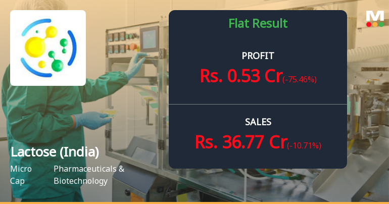 "description": "Lactose (India) Limited, a Gujarat-based pharmaceutical ingredients manufacturer, reported a sharp deterioration in profitability for Q3 FY26, with net profit collapsing 75.46% quarter-on-quarter to ₹0.53 crores from ₹2.16 crores in Q2 FY26. The ₹133-crore market capitalisation company's results revealed concerning margin compression despite modest revenue growth, triggering a bearish technical reversal that has pushed the stock down 32.55% over the past year."