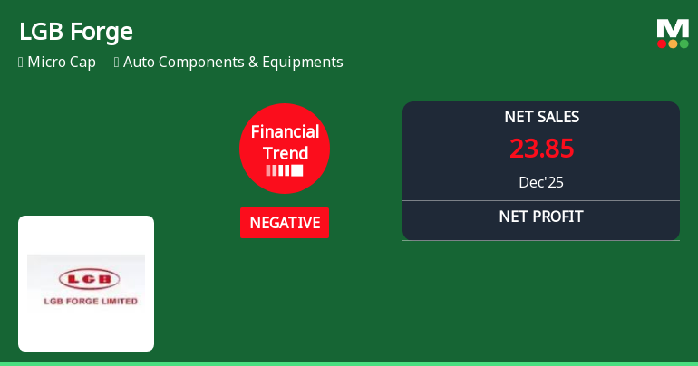 2026-02-05 17:48:05LGB Forge Ltd., a Coimbatore-based auto components manufacturer, reported a staggering quarterly loss of ₹1.86 crores in Q3 FY26, marking a dramatic deterioration from the ₹0.88 crores profit recorded in Q1 FY26. The loss represents a sequential deepening of 154.79% from Q2 FY26's ₹0.73 crores loss and a 332.56% year-on-year decline from Q3 FY25's ₹0.43 crores loss. With a market capitalisation of just ₹166.00 crores, the micro-cap forging specialist is grappling with collapsing margins and operational inefficiencies that have eroded investor confidence, sending the stock plummeting 44.90% over the past year to ₹7.18.