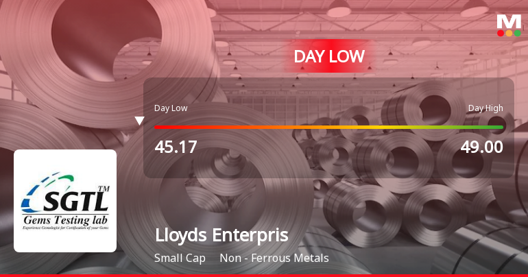 "description": "Lloyds Enterprises Ltd experienced a significant intraday decline on 4 Mar 2026, touching a low of Rs 45.17, down 8.99% from the previous close. The stock underperformed its sector and broader market indices, continuing a four-day losing streak amid persistent selling pressure and subdued market sentiment."
