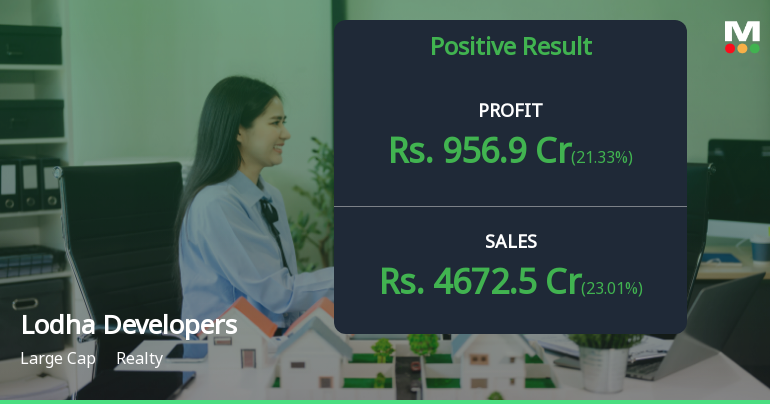 2026-01-29 19:24:42Lodha Developers Ltd has reported a strong financial performance for the quarter ended December 2025, showcasing significant operational strength. The company achieved net sales of ₹4,672.50 crores, reflecting a quarter-on-quarter growth of 23.01%, which is a notable increase compared to the previous quarter's growth of 8.79%. This marks the highest quarterly sales figure recorded by the company to date. Additionally, the net profit for the same period reached ₹956.90 crores, representing a quarter-on-quarter growth of 21.33%, again surpassing the previous quarter's growth of 16.90%. The operating profit margin (excluding other income) also demonstrated resilience, expanding to 30.29%, which is an improvement from 29.19% in the prior quarter. This margin expansion indicates effective cost management and operational leverage as the company scales its operations. Despite these positive operational metrics, ...