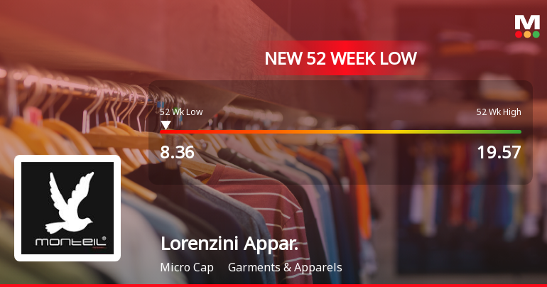 Lorenzini Apparels Ltd’s shares declined sharply to a fresh 52-week low of Rs.8.36 on 9 Jan 2026, marking a significant downturn amid broader market weakness and company-specific headwinds. The stock has underperformed its sector and the broader market over the past year, reflecting ongoing pressures on its financial performance and valuation metrics.