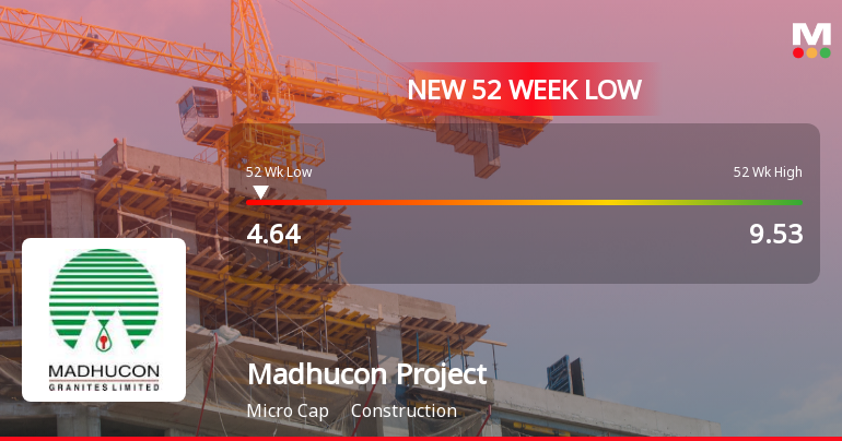 2026-02-03 11:12:08Madhucon Projects Ltd, a player in the construction sector, has touched a new 52-week low of Rs.4.64 today, marking a significant decline amid a sustained downward trend. The stock has underperformed both its sector and the broader market, reflecting ongoing pressures on its financial and operational metrics.