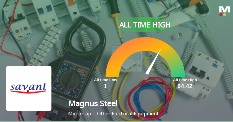 2026-03-04 11:08:36Magnus Steel & Infra Ltd has surged to a fresh 52-week and all-time high of Rs.64.42, marking a significant milestone in its market performance. The stock’s sustained momentum over the past three weeks has propelled it well above key moving averages, reflecting robust investor confidence within the Other Electrical Equipment sector.