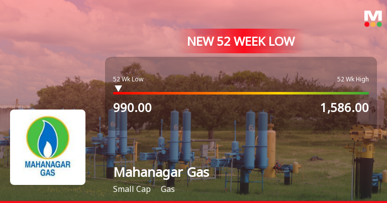 2026-03-16 11:33:43Mahanagar Gas Ltd. has declined to a fresh 52-week low of Rs. 990, marking a significant downturn in its stock performance amid broader market fluctuations and company-specific factors. The stock has underperformed its sector and key benchmarks, reflecting ongoing pressures on its financial metrics and valuation.