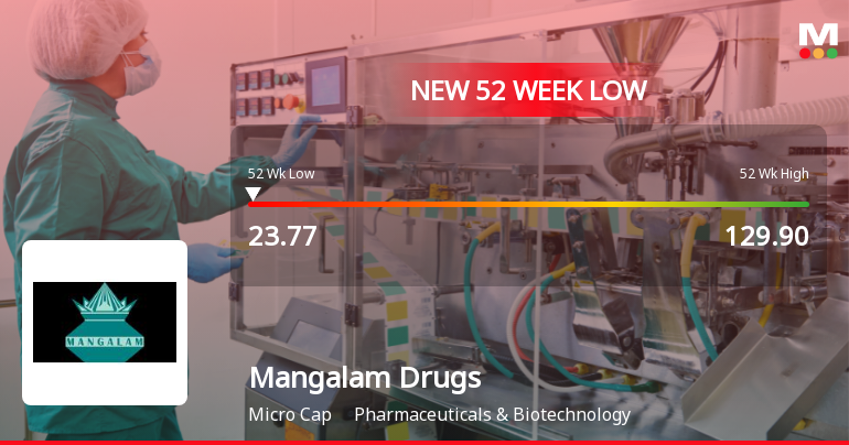 2025-12-09 11:45:33Mangalam Drugs and Organics has reached a new 52-week low price of Rs.23.77, marking a significant decline amid ongoing pressures in the Pharmaceuticals & Biotechnology sector. The stock has underperformed its sector peers and broader market indices, reflecting persistent challenges in its financial performance and market valuation.