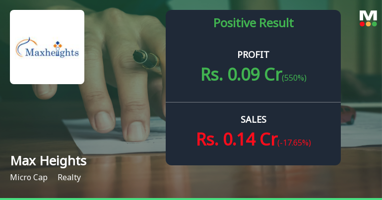 2026-02-06 21:01:06Max Heights Infrastructure Ltd., a Delhi-based micro-cap real estate company with a market capitalisation of ₹21.00 crores, continues to grapple with inconsistent financial performance and operational challenges. In Q3 FY26 (October-December 2025), the company posted a consolidated net loss of ₹0.11 crores, reversing from a profit of ₹0.66 crores in Q2 FY26—a sharp sequential decline of 116.67%. This marks yet another quarter of volatility for the company, which has struggled to establish consistent profitability despite impressive long-term sales growth of 41.28% over five years.