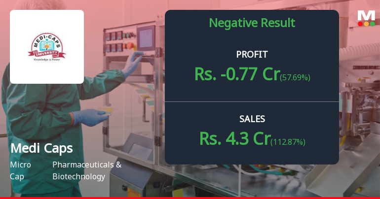 2026-02-12 19:56:36Medi Caps Ltd's latest financial results indicate a company facing significant operational challenges. In the quarter ended December 2025, the company reported net sales of ₹4.30 crores, reflecting a sequential improvement of 112.87% from the previous quarter. However, this increase is overshadowed by a year-on-year decline of 56.61%, highlighting persistent structural issues within its core capsule manufacturing business. The company posted a net loss of ₹0.77 crores for the quarter, which represents a 62.44% deterioration compared to the same period last year. The operating margin was deeply negative at -24.71%, indicating ongoing operational inefficiencies and an inability to generate sustainable sales volumes. Furthermore, the return on equity has fallen to -4.84%, reflecting the company's struggles to provide returns on the capital employed. Despite the sequential revenue growth, the overall financia...