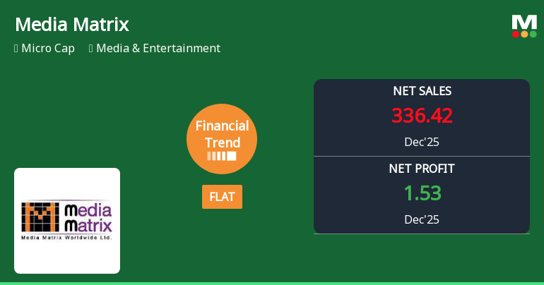 2026-02-10 19:04:48Media Matrix Worldwide Ltd., a micro-cap digital media content distributor with a market capitalisation of ₹1,093 crores, reported a consolidated net profit of ₹1.43 crores for Q2 FY26, reflecting a marginal 3.38% sequential decline from ₹1.48 crores in Q1 FY26 and a 4.03% year-on-year decline from ₹1.49 crores in Q2 FY25. The quarter witnessed significant revenue volatility as net sales surged 65.30% quarter-on-quarter to ₹386.22 crores but plunged 65.69% year-on-year, raising questions about the sustainability of the company's revenue streams and business model consistency.