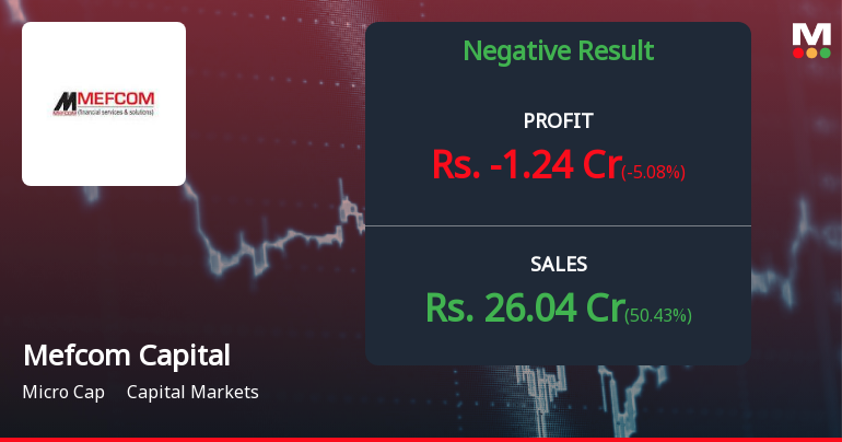"description": "Mefcom Capital Markets Ltd's latest financial results for the quarter ending December 2025 reveal a complex scenario of operational challenges and volatility. The company reported net sales of ₹26.04 crores, reflecting a significant quarter-on-quarter growth of 50.43% from ₹17.31 crores in the previous quarter. However, this figure is still 36.05% lower than the ₹40.72 crores recorded in the same quarter a year ago, indicating ongoing difficulties in maintaining consistent revenue levels.\n\nDespite the sequential revenue recovery, Mefcom Capital continues to face challenges in profitability. The consolidated net loss for Q3 FY26 was ₹1.24 crores, which is a slight widening from the ₹1.18 crores loss in Q2 FY26. This persistent loss underscores the company's struggle to convert revenue into profit, as reflected in the negative operating margin of -4.42%, although this margin has improved from -7.16% in the pr..."