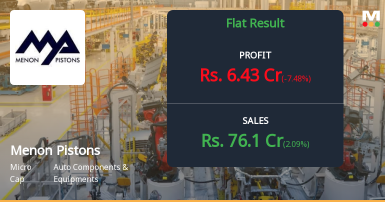 Menon Pistons has demonstrated impressive gains over recent weeks and months, significantly outperforming the broader market benchmark, the Sensex. Over the past week, the stock surged by 5.50%, while the Sensex declined by 1.00%. This positive trend extends over the last month and year-to-date periods, with the stock rising 7.40% and 7.38% respectively, contrasting with the Sensex’s declines of 4.67% and 5.28% over the same intervals. Such relative strength highlights growing investor confidence in the company’s near-term prospects.