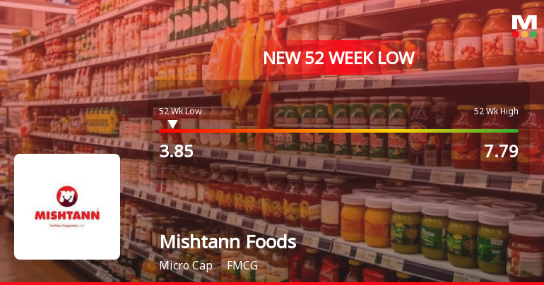 Shares of Mishtann Foods Ltd, a player in the FMCG sector, declined sharply to a new 52-week low of Rs.3.85 on 9 Mar 2026, reflecting ongoing pressures within the company and the broader market environment. The stock underperformed its sector and key indices, marking a notable shift in its recent trading pattern.