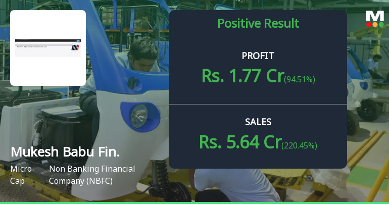 2026-01-30 20:02:35Mukesh Babu Financial Services Ltd., a micro-cap non-banking financial company, reported consolidated net profit of ₹1.77 crores for Q3 FY26 (December 2025), marking a sharp 94.51% quarter-on-quarter surge from ₹0.91 crores in Q2 FY26. However, the year-on-year comparison reveals a concerning 196.20% decline from a loss of ₹1.84 crores in Q3 FY25, highlighting the extreme earnings volatility plaguing this ₹80 crore market capitalisation entity. The stock surged 18.82% to ₹136.70 following the results announcement, yet remains 9.47% below its 52-week high of ₹151.00, reflecting investor uncertainty about the sustainability of recent improvements.