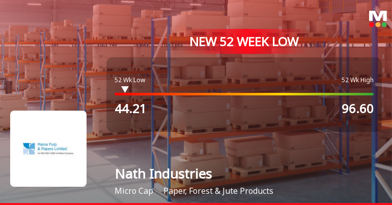 2026-03-16 10:49:23Nath Industries Ltd, a micro-cap player in the Paper, Forest & Jute Products sector, touched a new 52-week low of Rs.44.21 today, marking a significant decline in its stock price amid broader market pressures and company-specific performance factors.