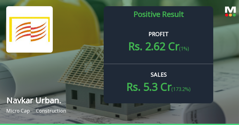 2026-02-16 23:03:35Navkar Urbanstructure Ltd., a micro-cap construction and infrastructure company specialising in ready-mix concrete and RCC pipes, reported a dramatic turnaround in Q3 FY26 with net profit surging to ₹2.62 crores compared to ₹0.91 crores in the year-ago quarter—a remarkable 187.91% year-on-year increase. However, this profit recovery occurred against a backdrop of declining revenues, with net sales plunging 38.44% year-on-year to ₹5.30 crores from ₹8.61 crores in Q3 FY25.