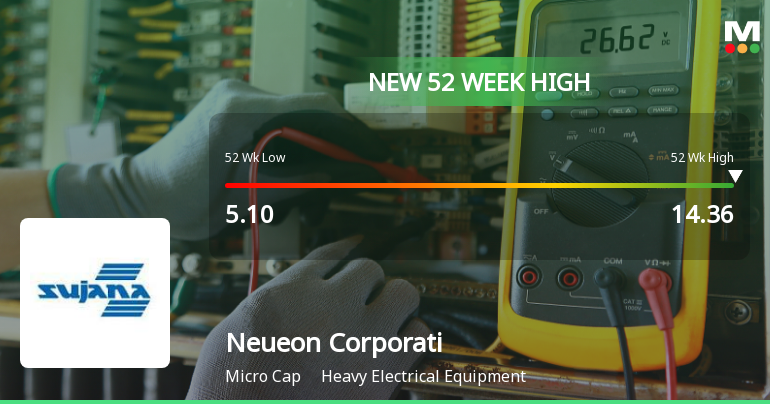 2026-03-09 12:23:38Neueon Corporation Ltd, a key player in the Heavy Electrical Equipment sector, reached a significant milestone today by hitting a new 52-week high of Rs.14.36. This achievement marks a continuation of the stock’s strong upward momentum, reflecting robust market performance amid a challenging broader index environment.