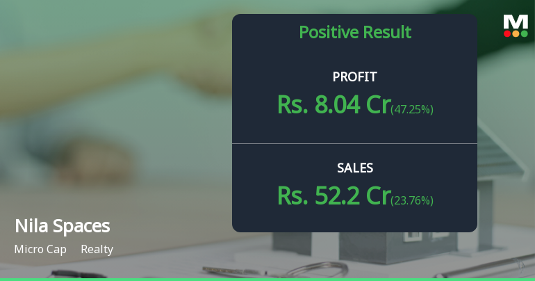 2026-01-30 17:48:38Nila Spaces Ltd., the Ahmedabad-headquartered real estate developer, reported a remarkable 114.40% year-on-year surge in consolidated net profit to ₹8.04 crores in Q3 FY26, driven by robust revenue growth and expanding operating margins. The micro-cap realty firm, with a market capitalisation of ₹552.00 crores, posted net sales of ₹52.20 crores for the quarter ended December 2025, marking a 58.09% increase from the corresponding period last year. Following the results announcement, the stock traded at ₹14.28, up 1.13% from the previous close, though it remains 30.24% below its 52-week high of ₹20.47.