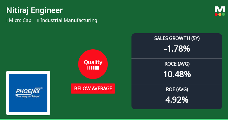 2026-02-17 08:01:16Nitiraj Engineers Ltd, a player in the industrial manufacturing sector, has recently seen its quality grade downgraded from average to below average, prompting a thorough examination of its business fundamentals. Despite a strong long-term return profile, key metrics such as return on equity (ROE), return on capital employed (ROCE), and growth rates have deteriorated, raising concerns about the company’s operational efficiency and financial health.