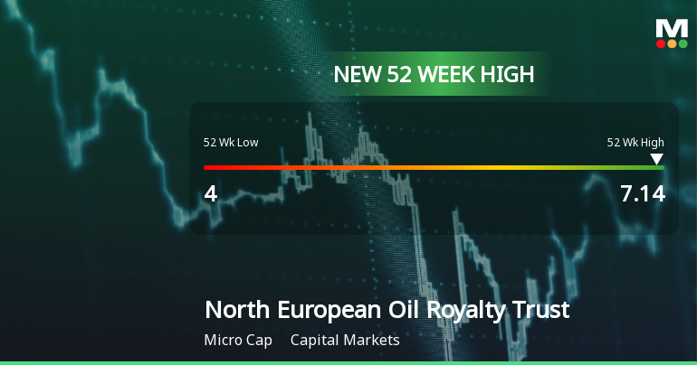 2026-01-05 16:47:07North European Oil Royalty Trust achieved a new 52-week high of USD 7.14, reflecting an 18.99% gain over the past year. With a market capitalization of USD 48 million, a P/E ratio of 9.00, and a return on equity of 298.75%, the company demonstrates strong financial health and market positioning.