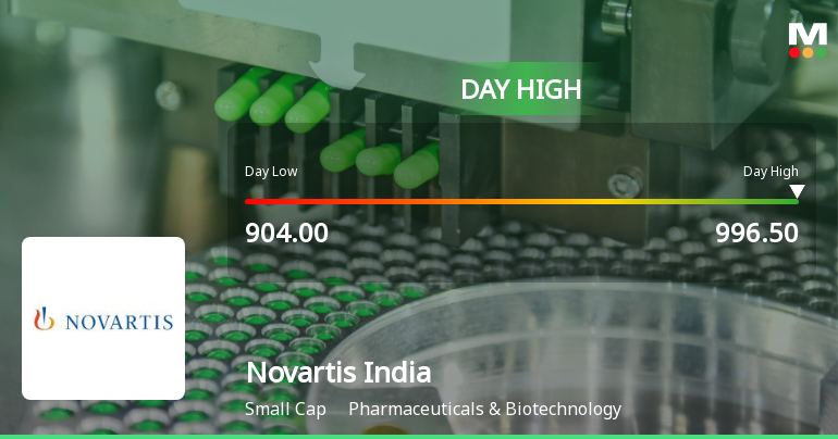 2026-02-20 09:32:14Novartis India Ltd recorded a robust intraday rally on 20 Feb 2026, surging to a day’s high of Rs 977.95, marking a 17.76% increase from the previous close. The stock outperformed its sector and the broader market, reflecting strong trading momentum amid a generally subdued Sensex session.
