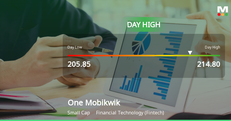 2026-02-03 11:07:49One Mobikwik Systems Ltd demonstrated robust intraday performance on 3 Feb 2026, surging to an intraday high of Rs 214.8, marking an 8.21% increase from its previous close. The stock outpaced its Financial Technology sector peers and broader market indices, reflecting notable trading momentum amid a mixed market backdrop.