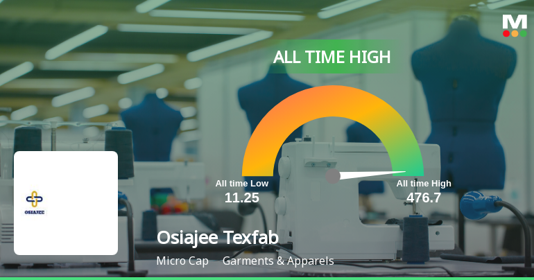 2026-01-27 10:38:31Osiajee Texfab Ltd has reached a significant milestone by hitting a new 52-week and all-time high of Rs.476.7 today, marking a remarkable surge in its stock price and reflecting sustained momentum in the garments and apparels sector.