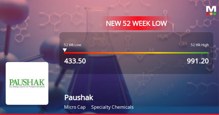 2026-03-02 13:49:07Paushak Ltd, a player in the Specialty Chemicals sector, has touched a new 52-week low of Rs.436 today, marking a significant decline amid ongoing downward momentum. The stock has underperformed both its sector and benchmark indices, reflecting a challenging period for the company’s market valuation.
