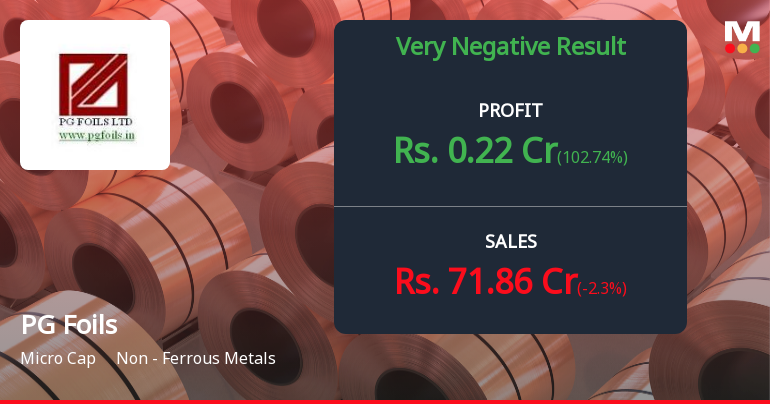 2026-02-14 09:00:47PG Foils Ltd., the Ahmedabad-based aluminium foil manufacturer, reported deeply concerning Q3 FY26 results that underscore mounting operational distress. The company posted net profit of merely ₹0.22 crores for the quarter ended December 2025, representing a catastrophic 97.92% decline year-on-year from ₹10.58 crores in Q3 FY25. Sequentially, the profit plummeted from a loss of ₹8.03 crores in Q2 FY26, though the marginal positive figure provides little comfort given the scale of operational deterioration.